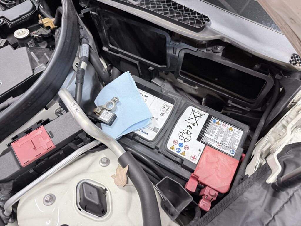 交換にあたって色々部品を外していきますが、スターターを取り外すので事前にバッテリーのマイナス端子を外します。