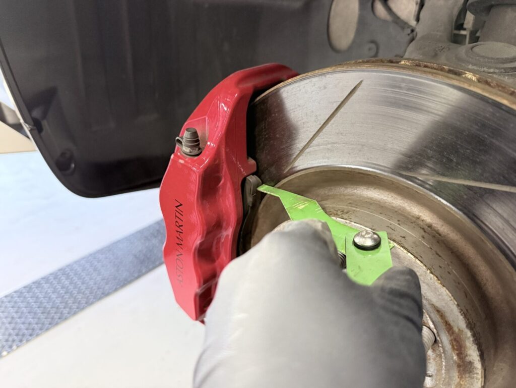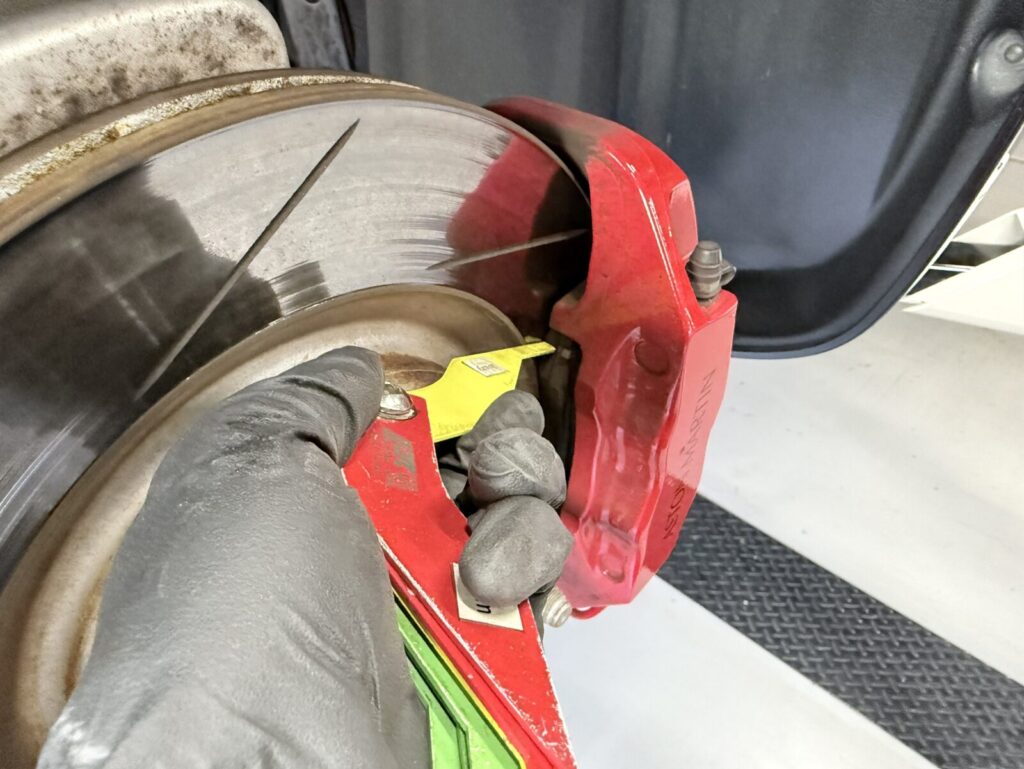 ブレーキパッドの残量を測り締め付けなど各部チェックします。