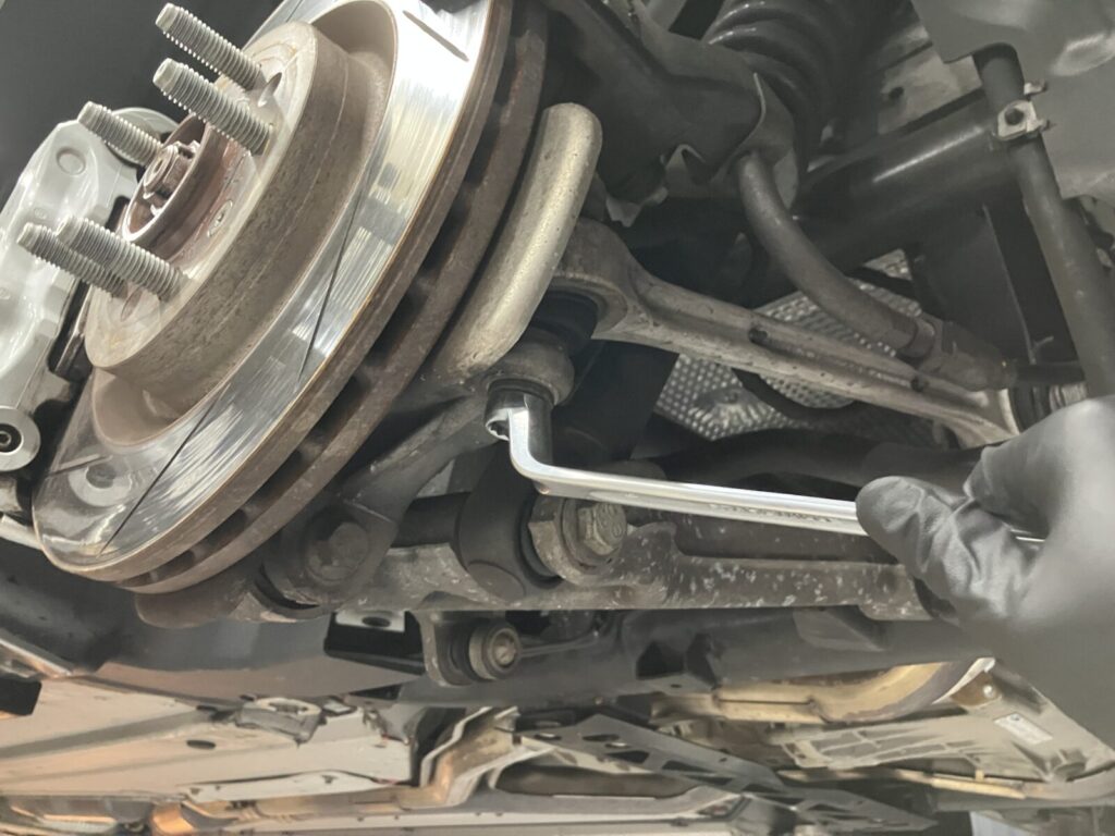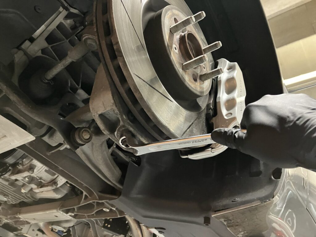 法定点検、車検の際はブレーキやショックアブソーバー、サスペンションアーム等の足まわり部品に緩みがないか、工具を用いて点検いたします。