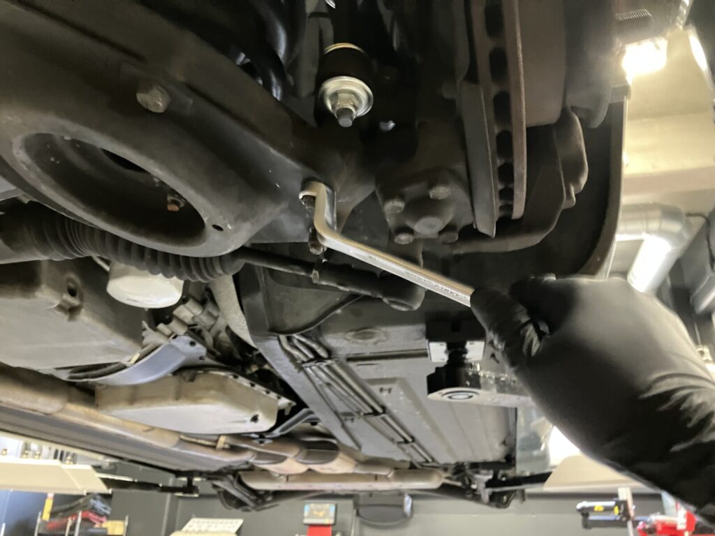 スタビライザー関連部品交換後は4輪ホイールアライメント調整を実施。