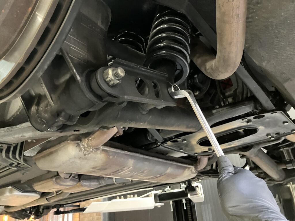 法定点検の際はブレーキやショックアブソーバー、サスペンションアーム等の足まわり部品に緩みがないか、工具を用いて点検いたします。
