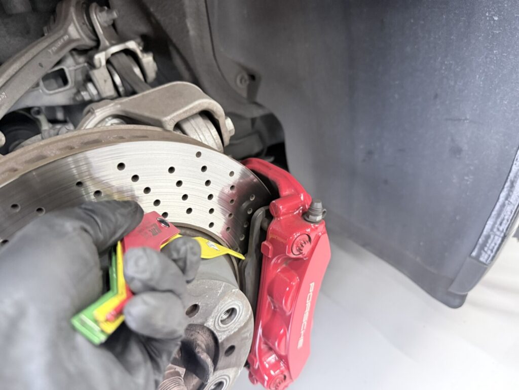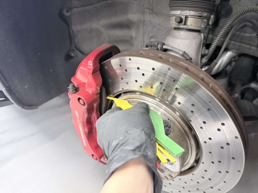 ブレーキパッドの残量の計測やディスクローターの摩耗具合を確認します。