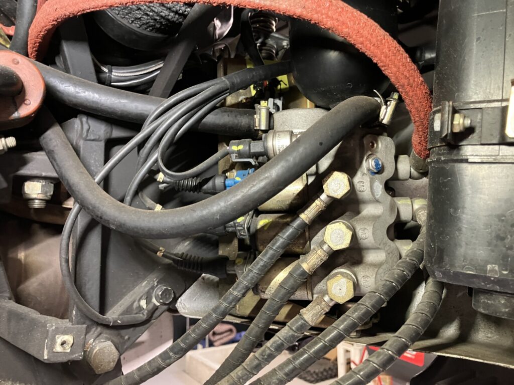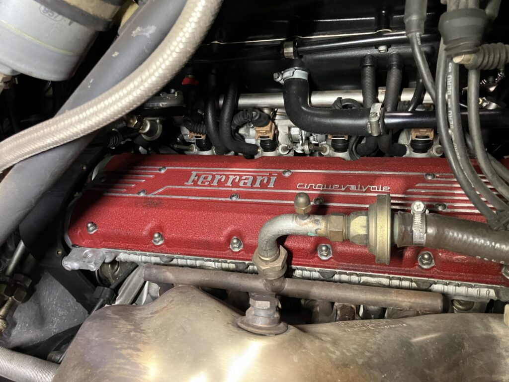 F355のノックセンサーはエンジンVバンク間、ヒートエクスチェンジャーの下側に2個取付けられています。