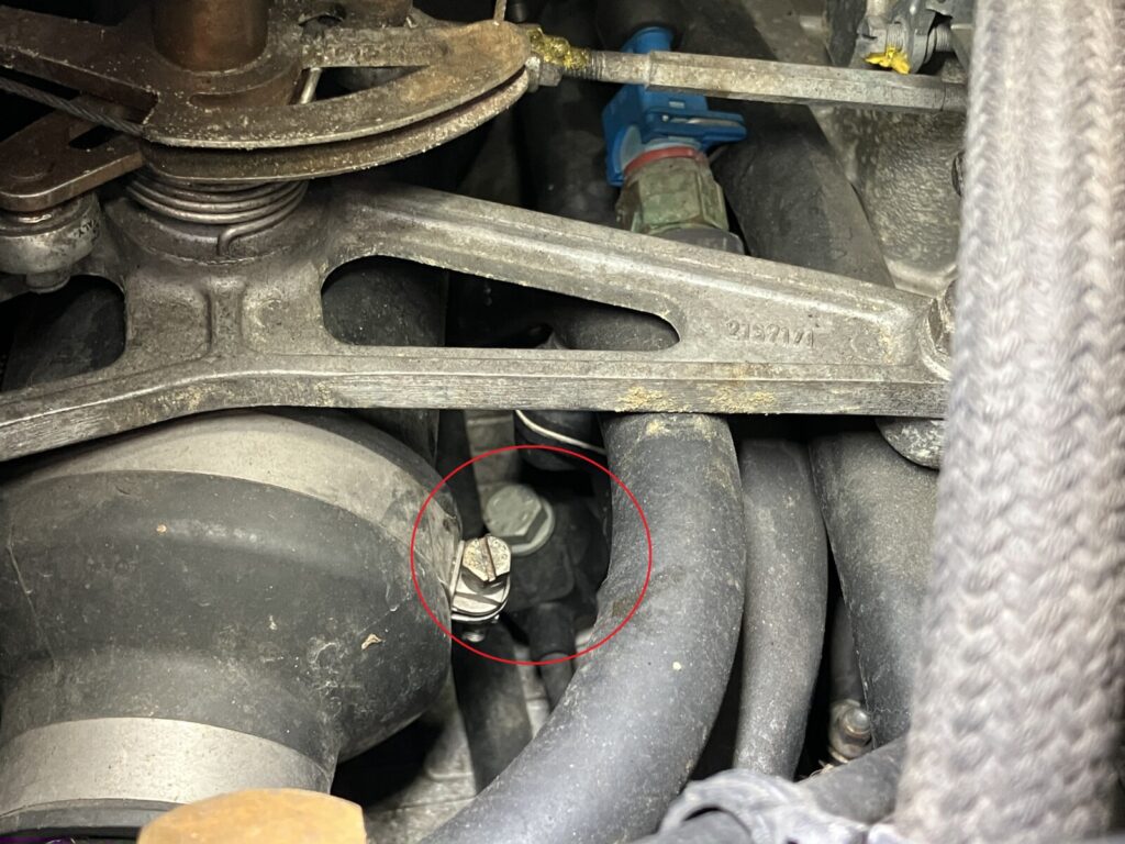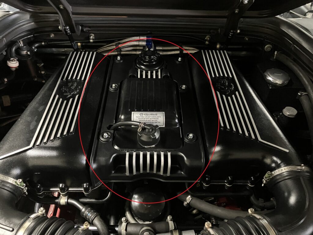 赤丸部分の冷却水エキスパンションタンクを取り外し、Vバンク間へアクセス。