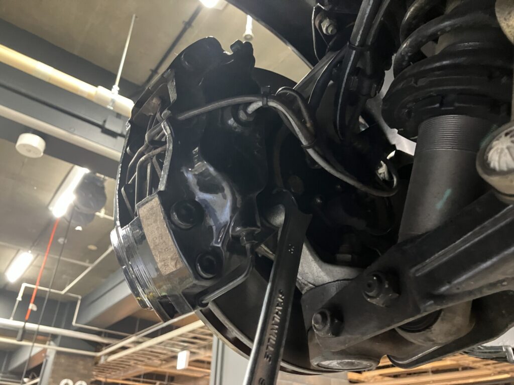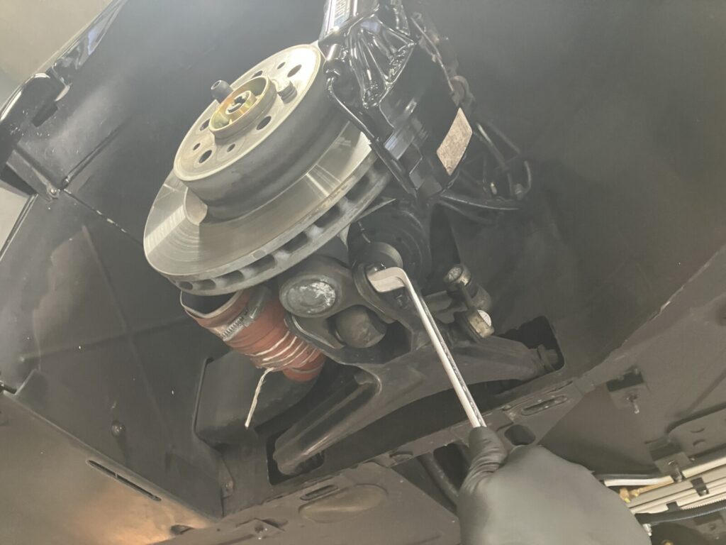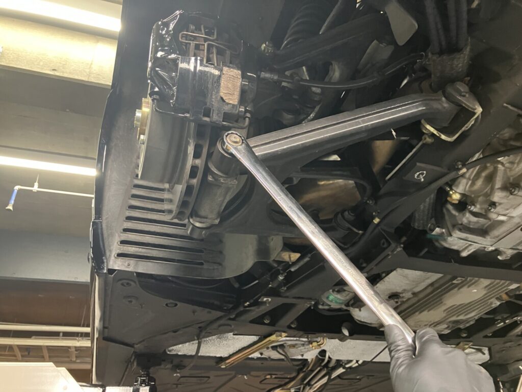法定点検の際はブレーキやショックアブソーバー、サスペンションアーム等の足まわり部品に緩みがないか、工具を用いて点検いたします。