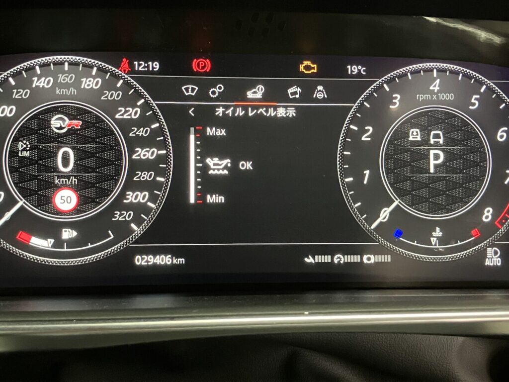 メーターにて注入したオイル量を確認。レンジローバースポーツは暖気後エンジンを停止、10分程度経過ののちエンジンは始動せずイグニッションONでオイル量を計量します。