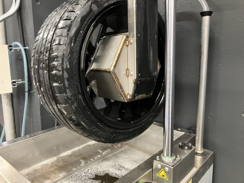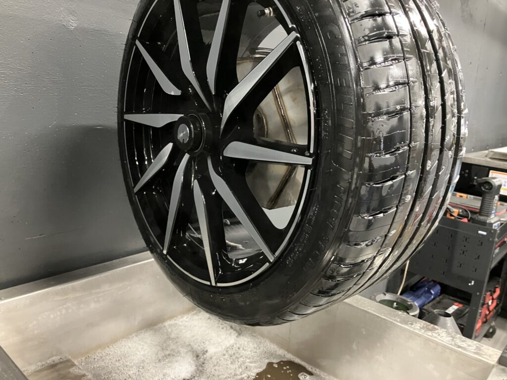 タイヤ交換後、洗浄機にてホイール洗浄をしていきます。