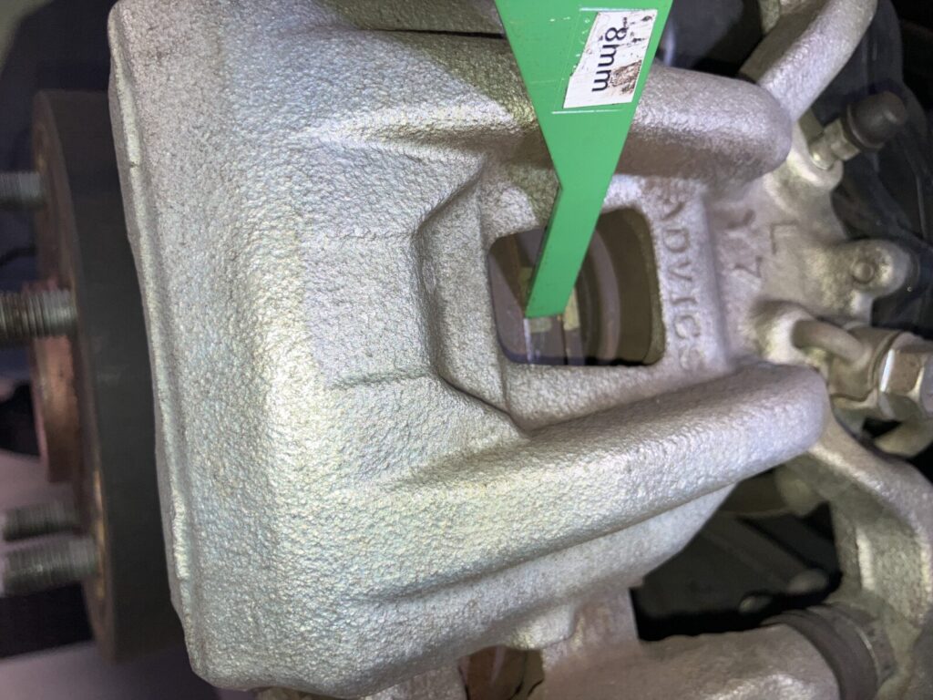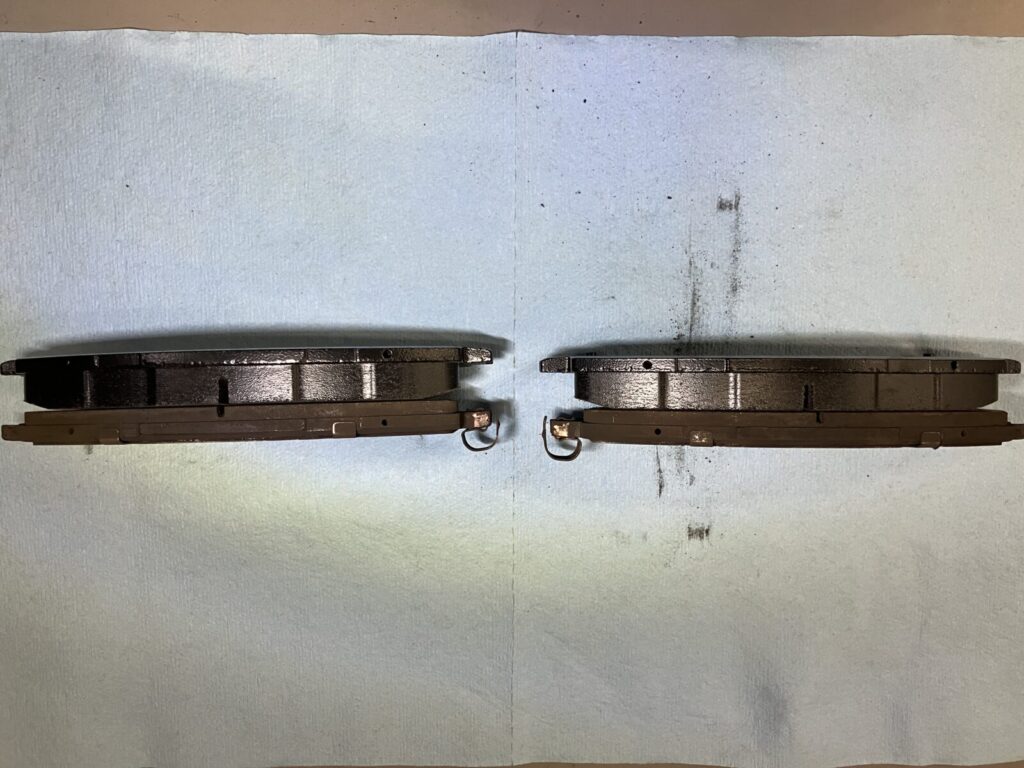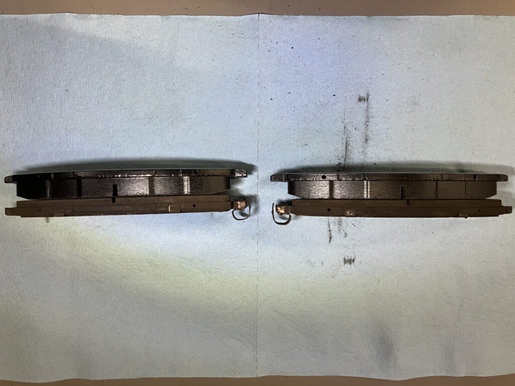 新品と比較すると残量の差が良くわかります。ブレーキパッドはギリギリまで使うのではなく、残量が4㎜程度で交換をおすすめいたします。ギリギリまで使用するとパッドの構造上効きが悪い状態となる可能性があり、制動性能に影響が出てしまいます。インジケーターが付いている車両は点灯すれば確実な交換時期です。高性能な車両であればなおさら規定値での交換が必要です。