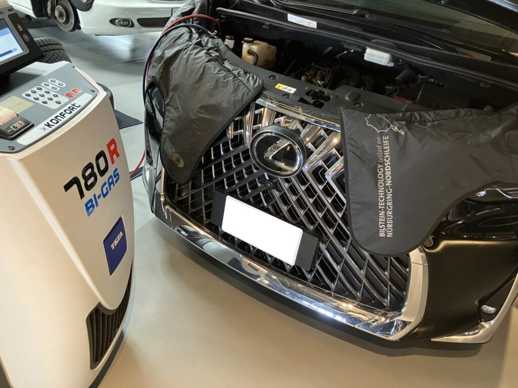 TEXA780Rという機器にてエアコンガスを一度回収し、クリーニングされたエアコンガスを規定量再充填することでエアコンの効きを回復させると共に、