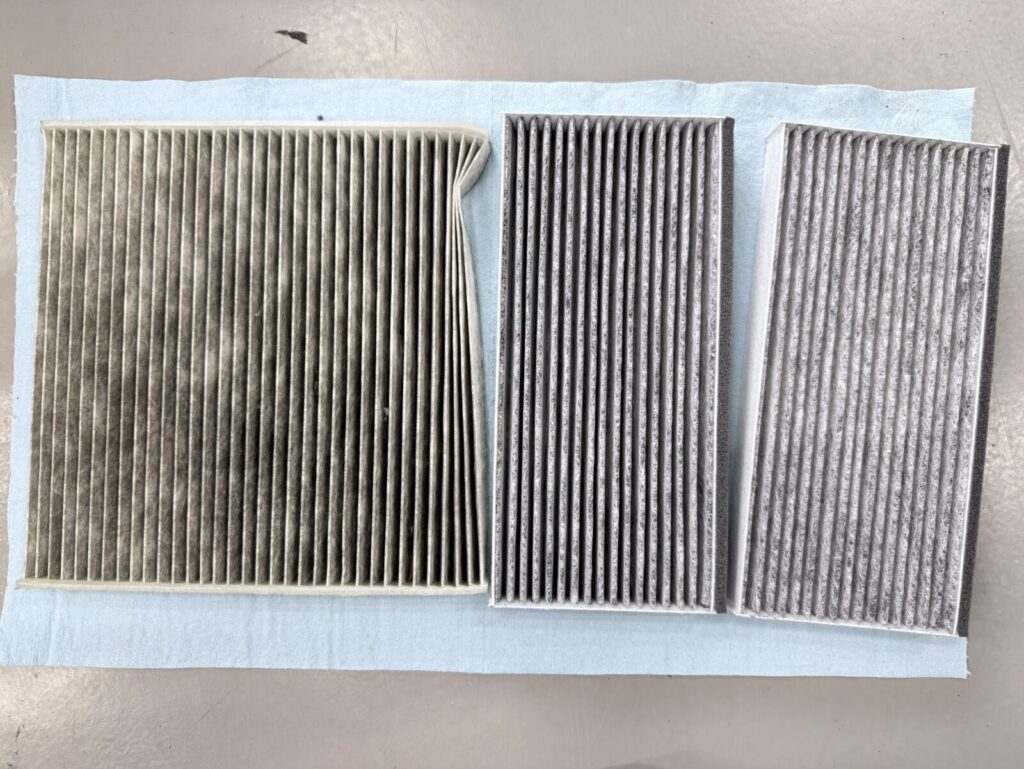 エアコンフィルターは、車外から取り込まれる空気や車内の空気をろ過して花粉やホコリ、ごみの集塵や活性炭などが含まれたフィルターで排気ガス臭・タバコ臭・ペットの臭いを吸収します。