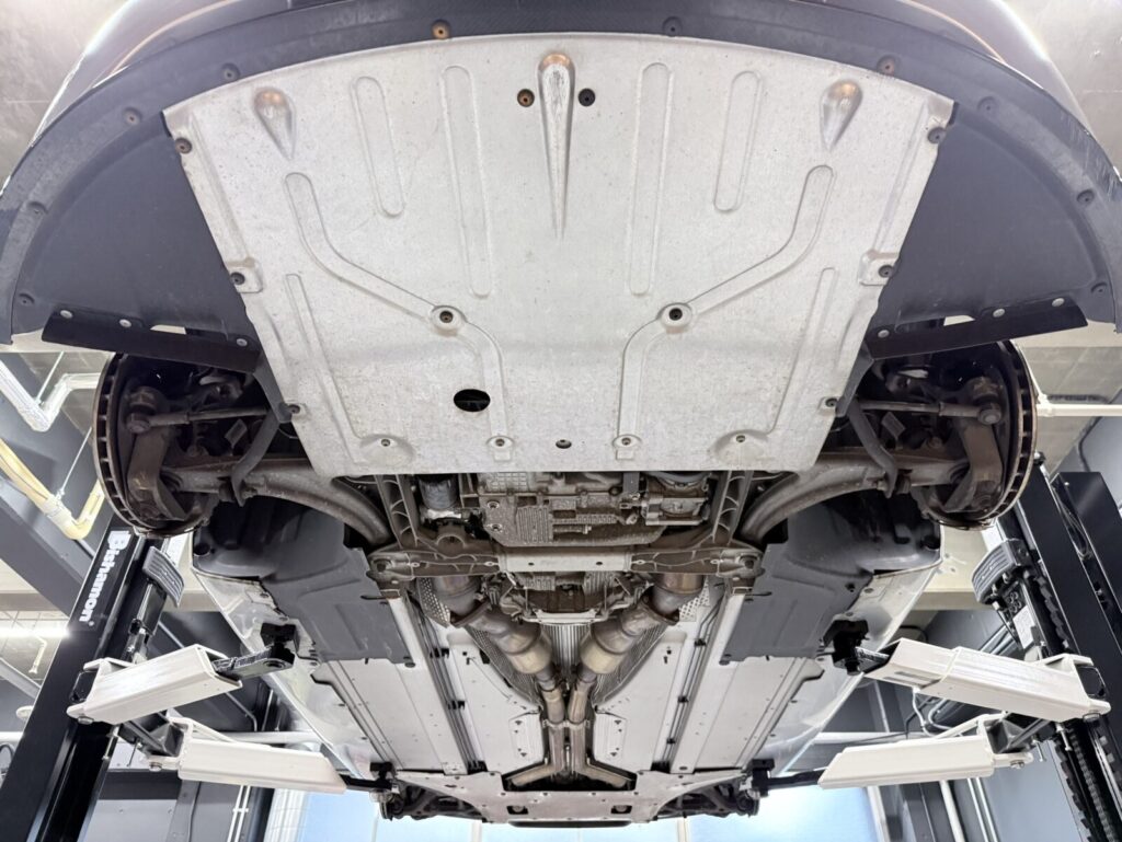 車両をリフトアップしタイヤを取り外し足回りと下回りの点検を行います。