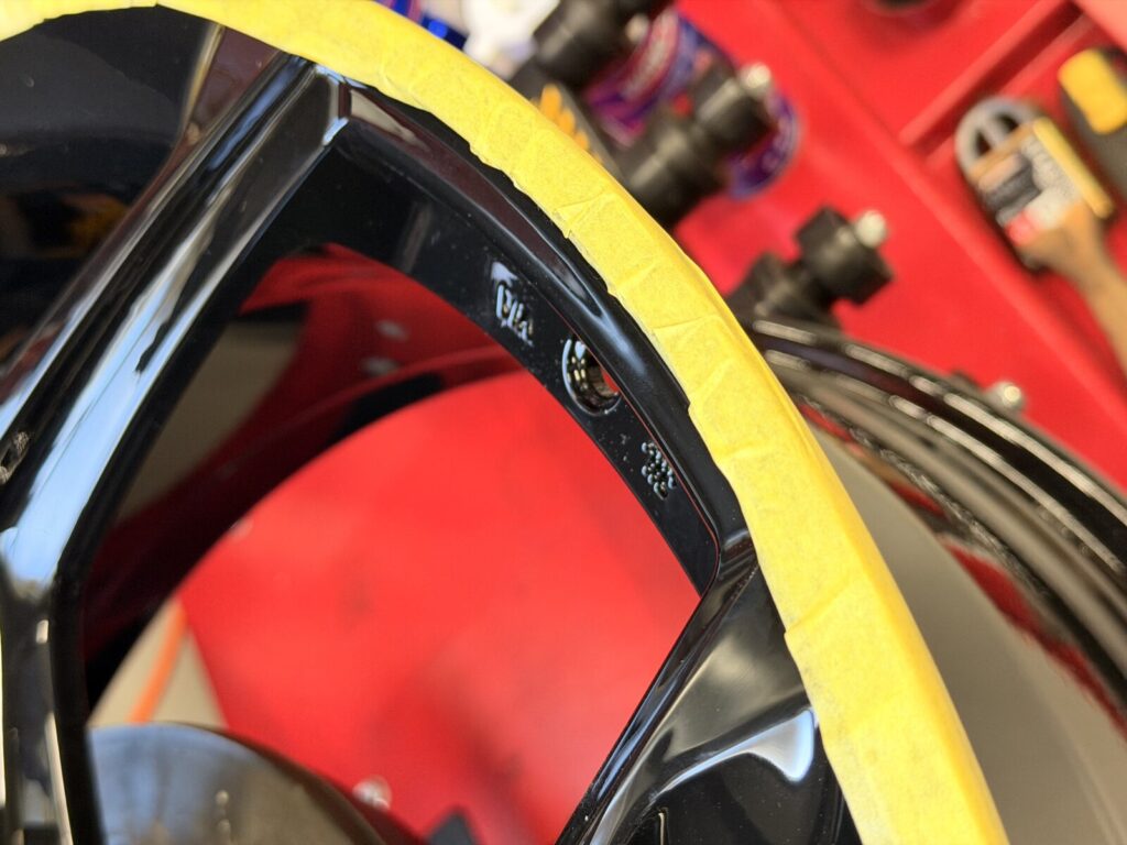 新品のホイールに傷がつかないようにしっかりと養生テーピングをします