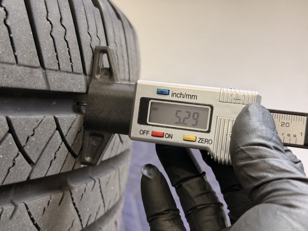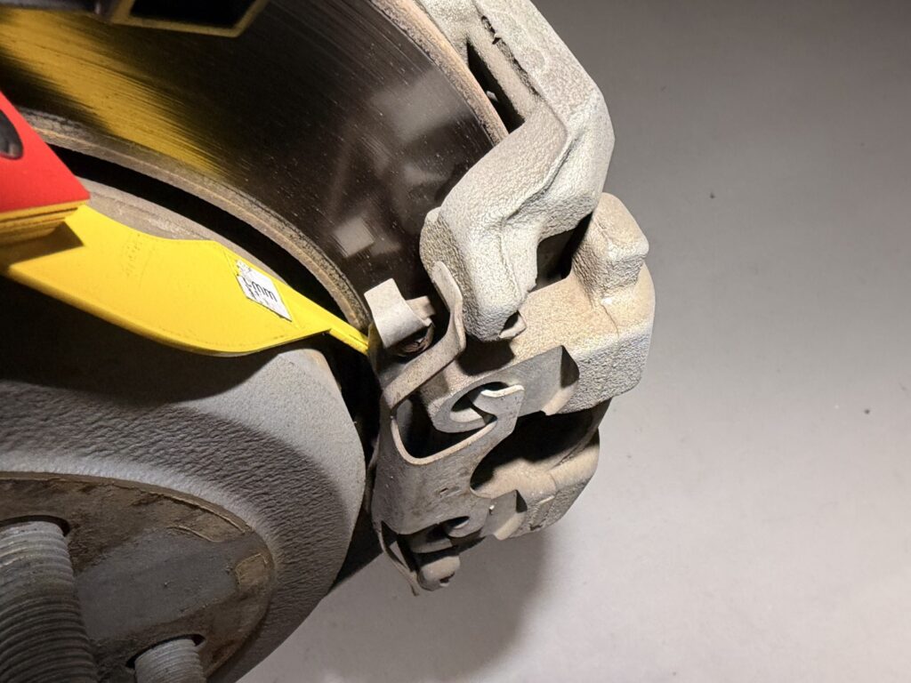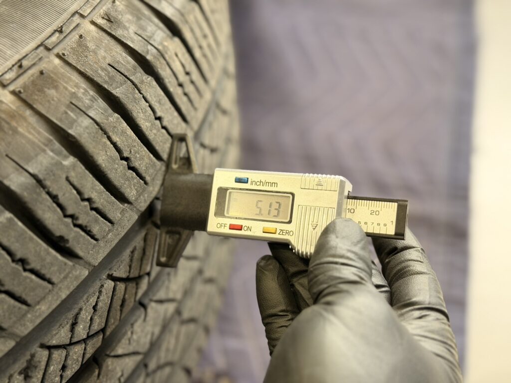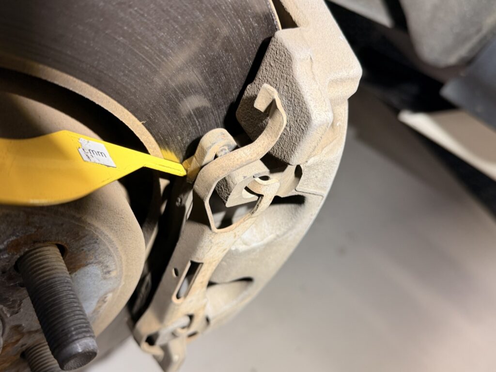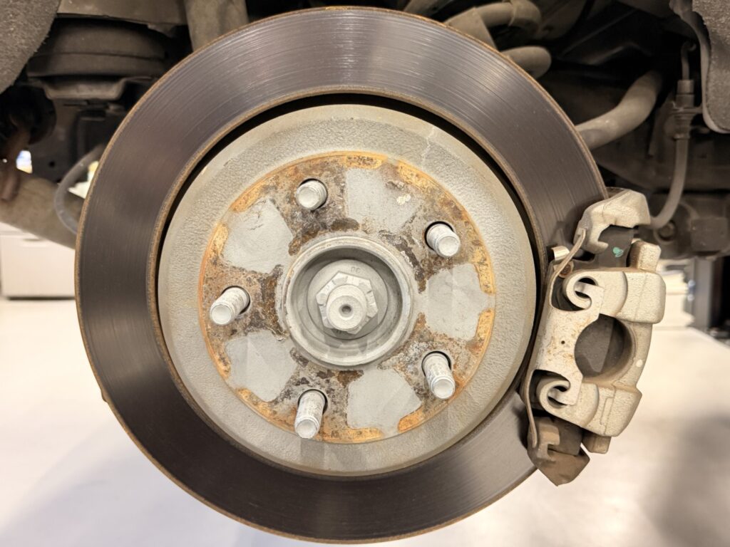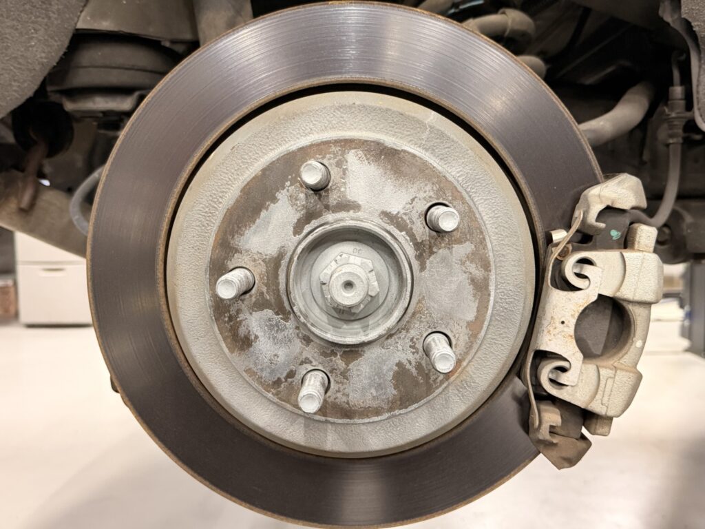 ブレーキディスクローターの状態とブレーキパッドの残量、タイヤの状態や溝の深さを点検します。
