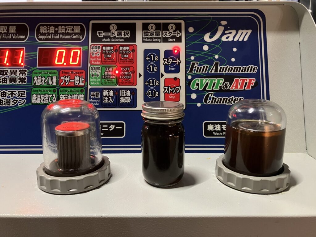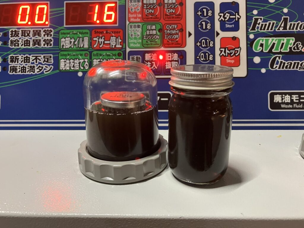 圧送交換後のAT内部を循環するATFと交換前のATF、違いは明らかです。