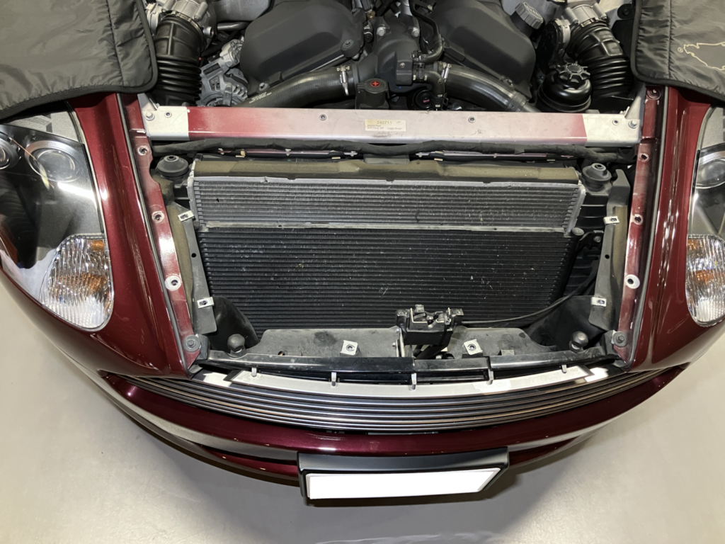 エンジンルームのフロント部分のカバーを取外しラジエータやコンデンサーの状態を確認をします。
