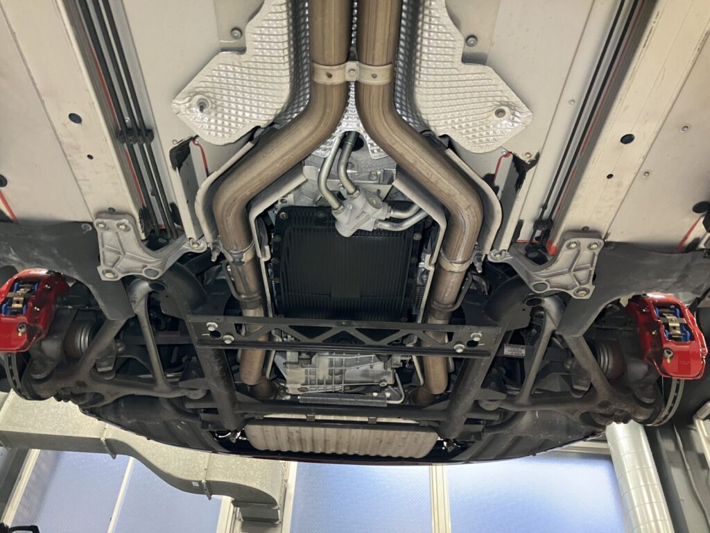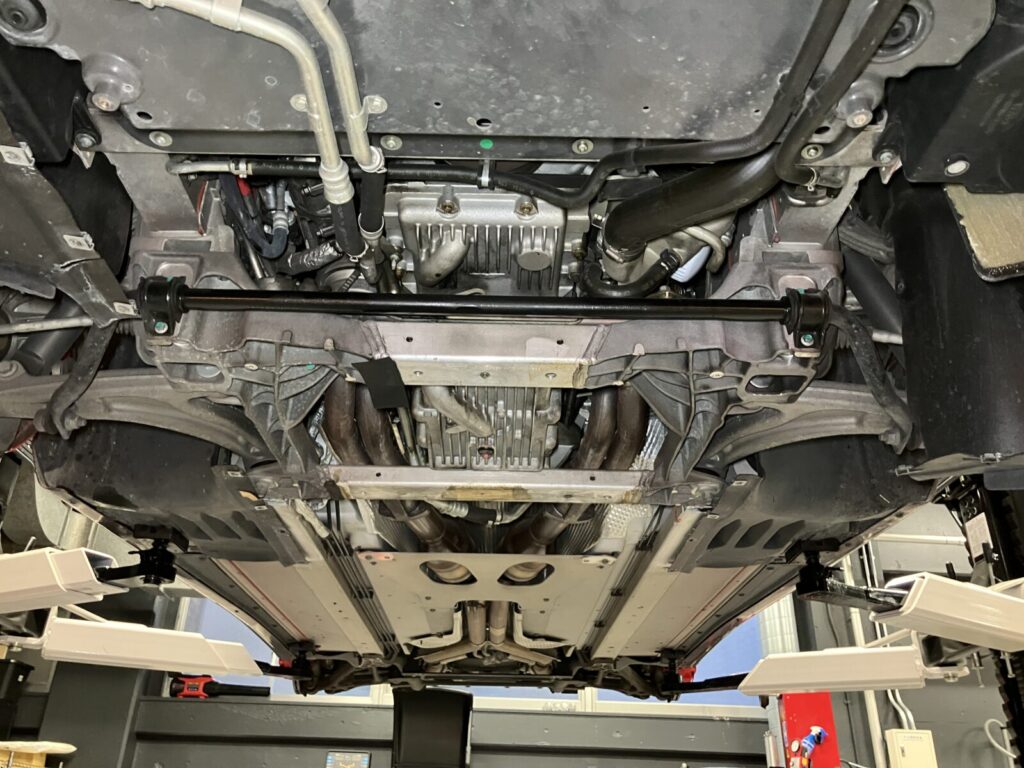 アンダーカバーを取外しフロントからリヤにかけて各部品の取付状態、ボディや足回りの損傷、配線や配管の損傷やオイル漏れ、冷却水漏れの有無を確認します。