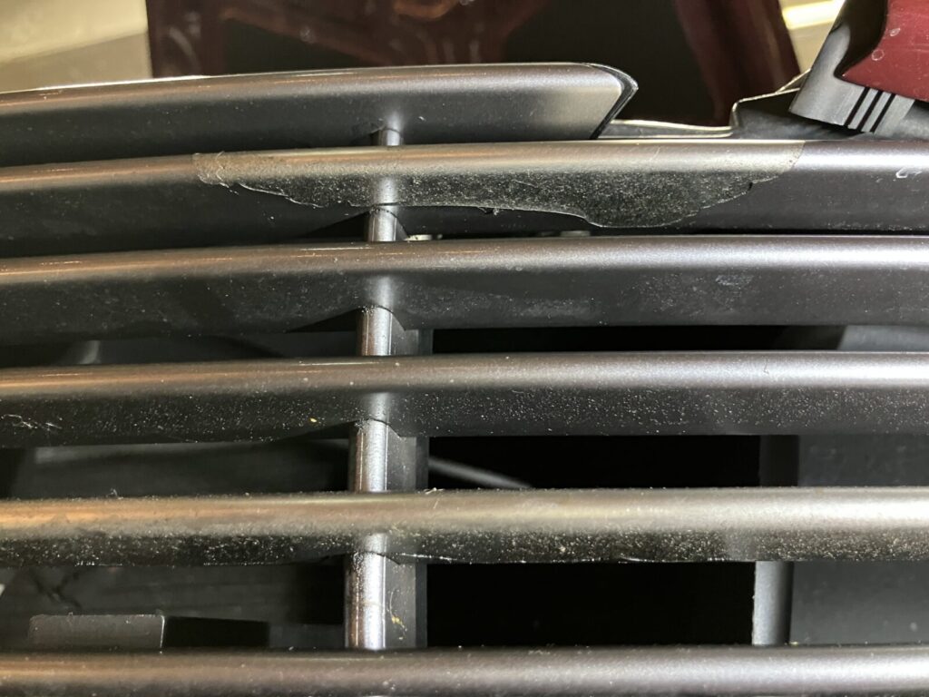 ところが実際グリルを取り外してみるとグリルを構成する骨格の一部である樹脂部分が経年により劣化してしまい、非常にもろい状態となっておりました。こうなってしまうと一時的に修復が出来ても塗装や再度の取付、使用に耐えることが難しい状態となってしまいます。