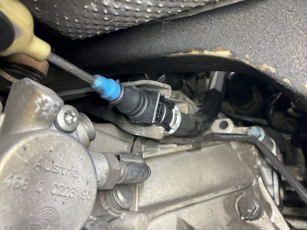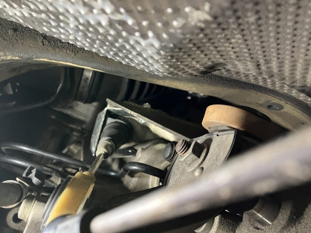 リフトアップし、ミッション側のワイヤー取り付け部を確認すると